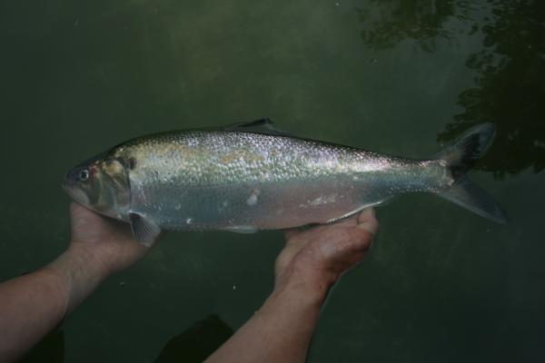 Der Maifisch ist eine große Heringsfischart, die früher zu Hunderttausenden zum Laichen aus dem Meer in den Rhein aufgestiegen ist - meist bis zur Barbenregion. Heute gibt es nur noch vereinzelte Tiere, die nach genetischen Analysen als Streuner aus französischen Beständen anzusehen sind.